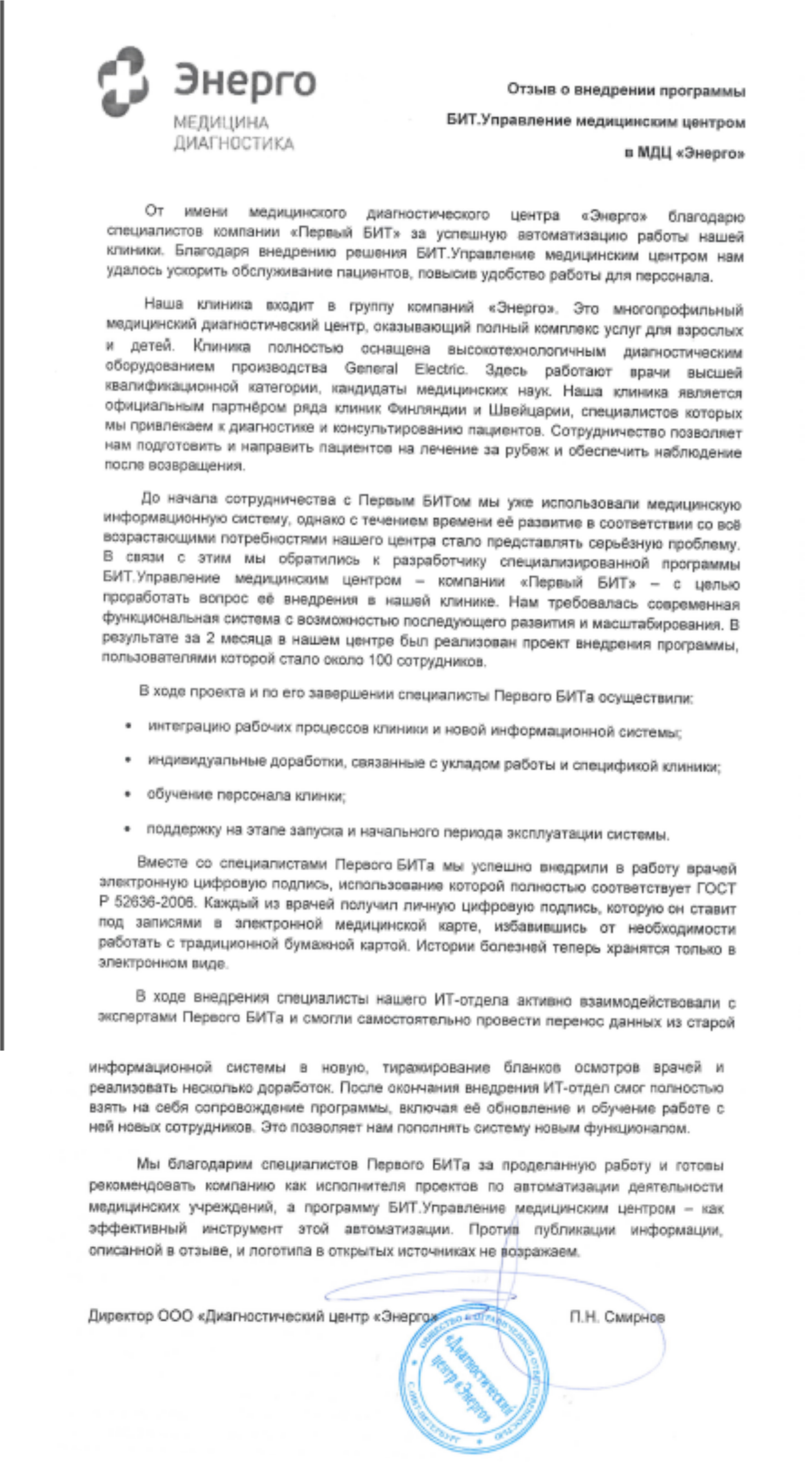 «Мы обратились к компании «Первый БИТ», так как нам требовалась современная функциональная система с возможностью последующего развития и масштабирования. В результате за два месяца в нашем центре был реализован проект внедрения программы БИТ.Управление медицинским центром.»