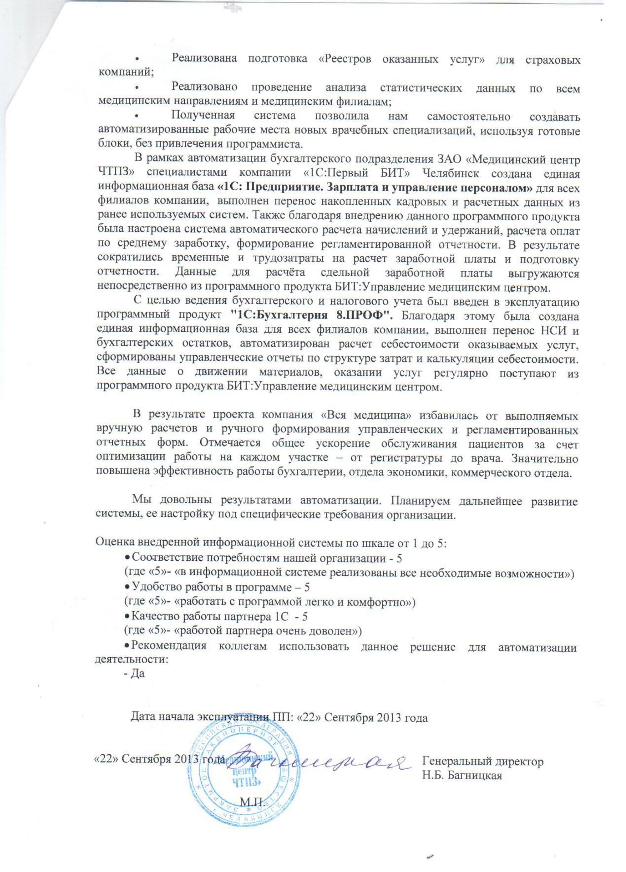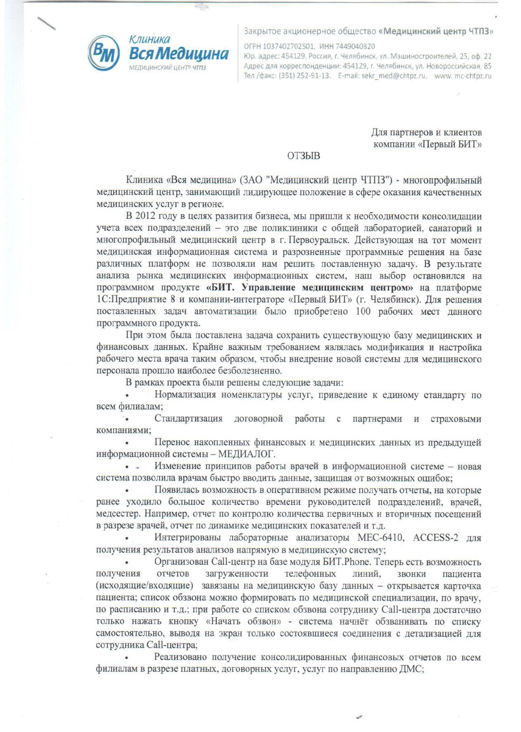 Внедрение программного продукта БИТ. Управление медицинским центром успешно решило задачу консолидации учета всех подразделений заказчика (две поликлиники с общей лабораторией, санатории, а также многопрофильный медицинский центр в г. Первоуральск), сохранив при этом существующую базу медицинских и финансовых данных, накопленных в использовавшейся ранее информационной системе.