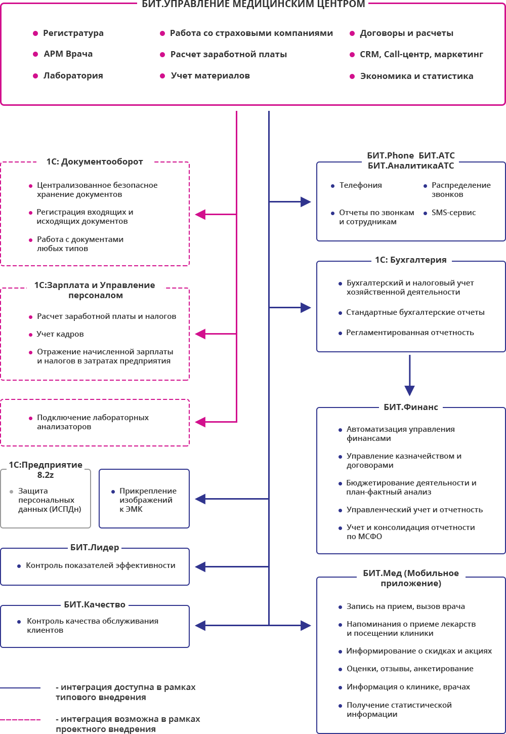 Конфигурация БИТ.Управление медицинским центром разработана на базе платформы 1С: Предприятие, что дает возможность реализовать обмен данными между различными учетными системами. Наиболее часто встречается интеграция с такими решениями, как: